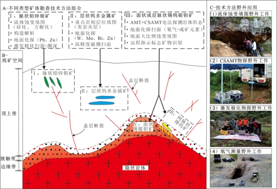 广西隐伏花岗岩区主要成矿类型深部找矿技术方法集成模式图